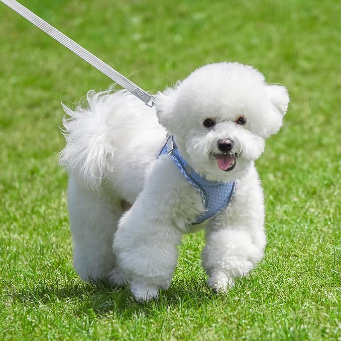 - SMALL DOG HARNESS AND LEASH SET - The Dog Harness and Leash Set for small dogs cats can be widely applied for walking, picnic, vacation, photo shoot, suitable for both outdoor and indoor activities. The vest-style design disperses the pressure through shoulders and chest, uniform force, no need to worry about the danger of suffocation or choking. Our hook and loop fastener, buckle and D-rings work together protect your pet in three layers of security.