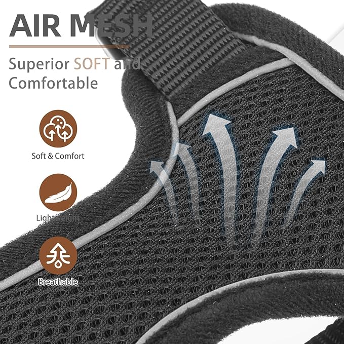 - [LIGHTWEIGH AND BREATHABLE] - The harness is made of quality polyester and air mesh fabric, your dog will not feel stuffy when wearing it, which keeps fur dry and comfortable. Besides, this harness is very lightweight so the dog will hardly feel the burden. Perfect for getting your furry kid dressed to go out and play.