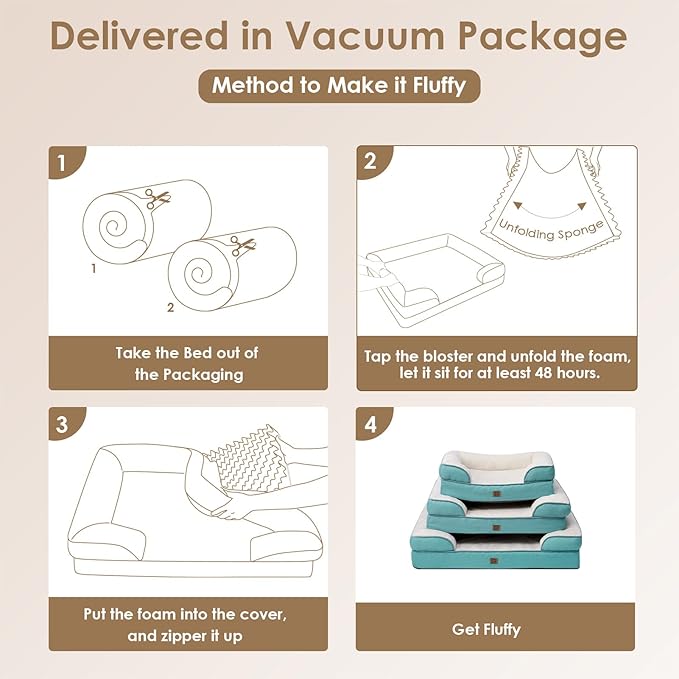 - CARE INSTRUCTIONS: Our dog bed features a removable and washable cover with a zipper closure, making it easy to clean. Remove the foam insert, and the cover can be washed in a machine. Please note that the foam insert is not washable. Allow the bed to expand for 24-48 hours after unpacking.