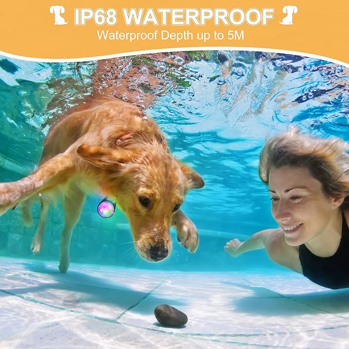 - 【IP68 Waterproof Dog Collar Light】The IP68 waterproof level surpasses other dog lights on the market, waterproof depth up to 5m, allows your dog to play in water or other harsh environments without worrying about damage. 0.53oz lightweight dog light will not make the dog tired