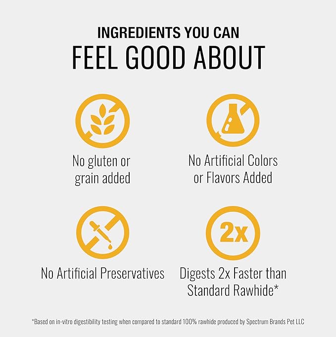 - HIGHLY DIGESTIBLE RAWHIDE: Digests 2x faster than standard rawhide.