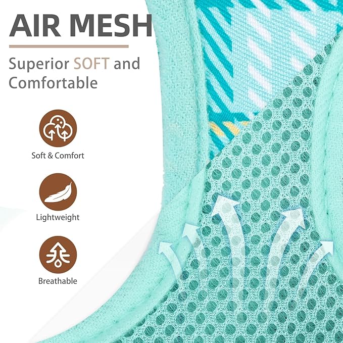 - [LIGHTWEIGH AND BREATHABLE] - The lining of harness is made of quality polyester and air mesh fabric, your dog will not feel stuffy when wearing it, which keeps fur dry and comfortable. Besides, this harness is very lightweight so the dog will hardly feel the burden. Perfect for getting your furry kid dressed to go out and play.