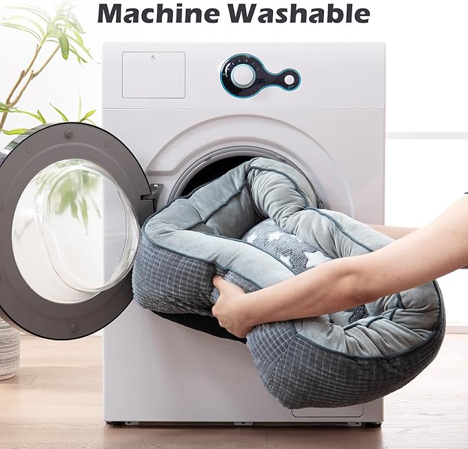 • Fashion Luxury Fabric: The comfortable dog bed is designed with gray Corn kernel stripes on the outside, and soft shu velveteen fabric on the inside, which is more fashionable with the Pentagram pattern. The side is designed with artificial suede wide strip edging, providing sufficient support for the dog bed. The filling material is 100% polypropylene cotton. which is safe, comfortable, and skin friendly.