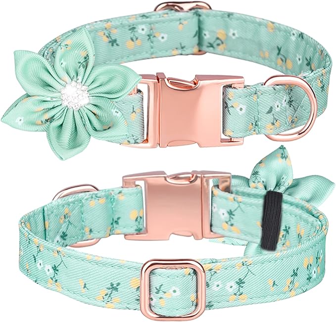 Floral Pattern Dog Collar - Cute Puppy Collar with Detachable Rhinestone Flower for Female Dogs (S, Green)