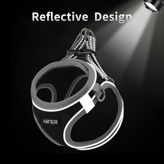 AMTOR Small Dog Harness with Leash Set, No Escape Easy Walk Puppy Harnesses for Training Walking, Step-in Reflective Soft Dogs Vest for XS S Medium Extra-Small Large Sized Dog(Black/Grey)