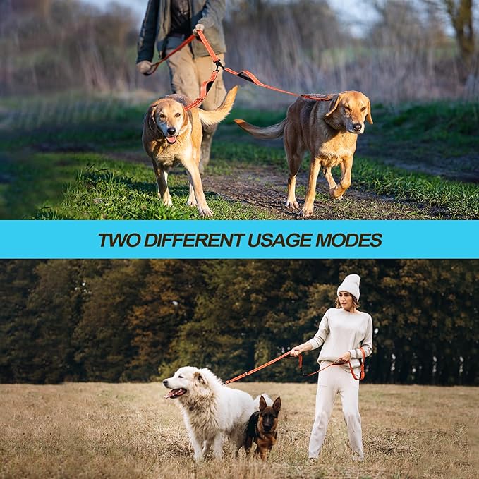 - No Tangle Double Dog Leash: 360° swivel clasps help to keep your dogs from getting tangled together. No need to worry about getting twisted two dog leash when dogs switch sides
