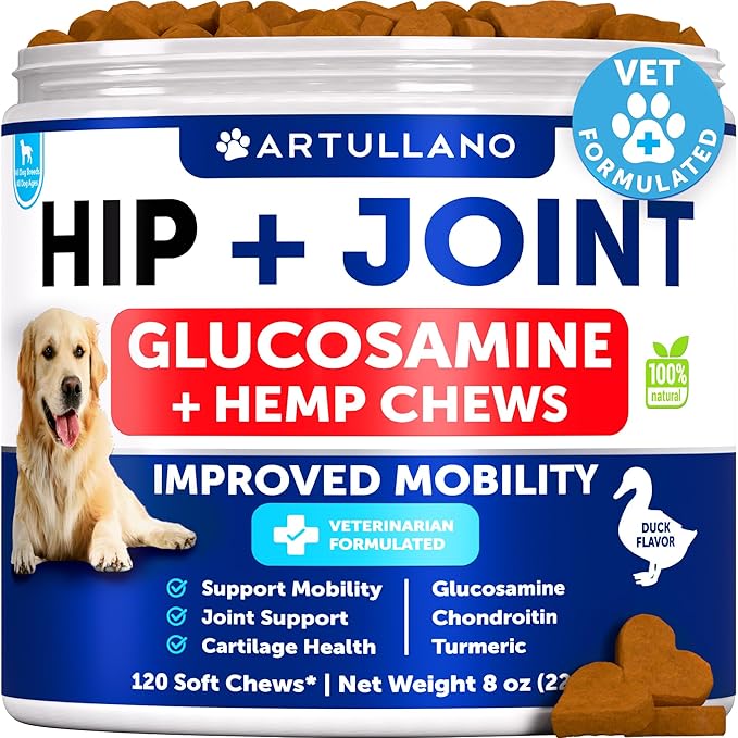 Hemp Hip and Joint Supplement for Dogs - Glucosamine for Dogs Joint Pain Relief - Chews with Chondroitin, MSM, Hemp Oil - Mobility Support, Cartilage Health - For Large, Small breeds - 120 Soft Treats