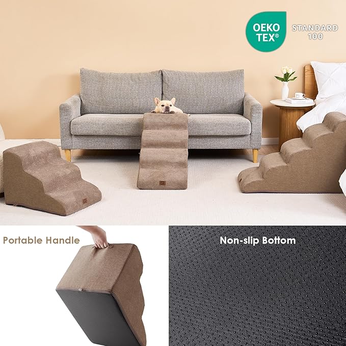 - COMFORTABLE PET STAIRS - This foam dog stair is designed directly against the edge of a bed, sofa or other furniture, so your pet can climb up and down comfortably.