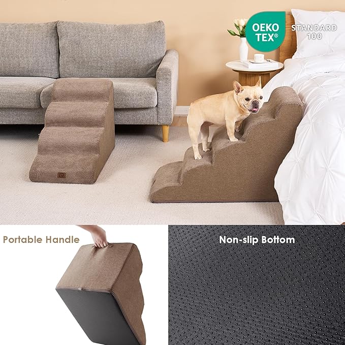 - COMFORTABLE PET STAIRS - This foam dog stair is designed directly against the edge of a bed, sofa or other furniture, so your pet can climb up and down comfortably.