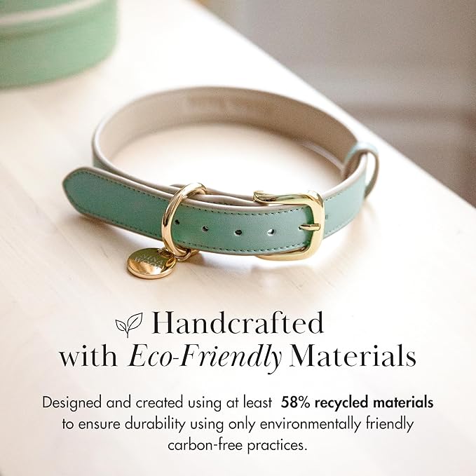 - SUSTAINABLE: The materials in our collar are made using at least 58% recycled polyurethane to ensure durability. With the goal of being carbon neutral, we track and offset the majority of our carbon-emitting activities. Our leather collar for dogs is handmade under fair and sustainable business principles. We pride ourselves on making designer dog collar leather products that are great for your dog and that you can feel good about.