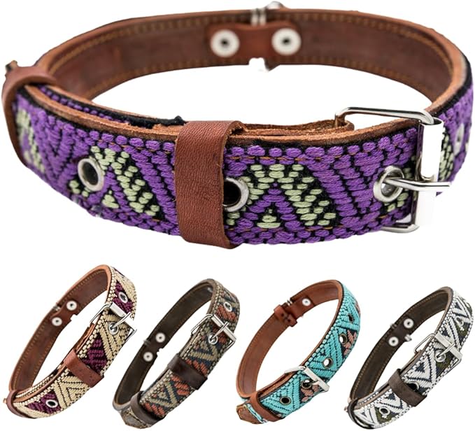 Western Dog Collar – Leather Embroidered Design for Small Medium Large Dogs & Puppy Pets - Aztec & Southwest for Boy and Girl Female & Male Dogs - Collar para Perros Beaded (Small, Amethyst)