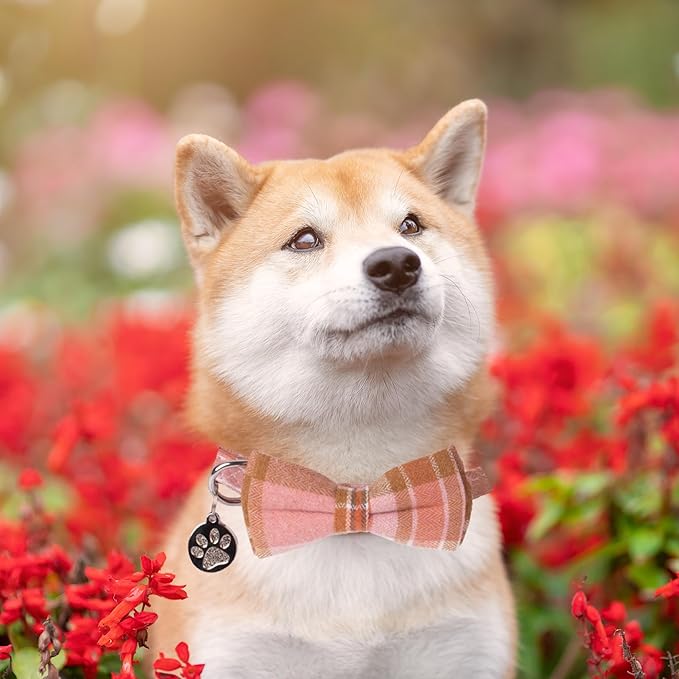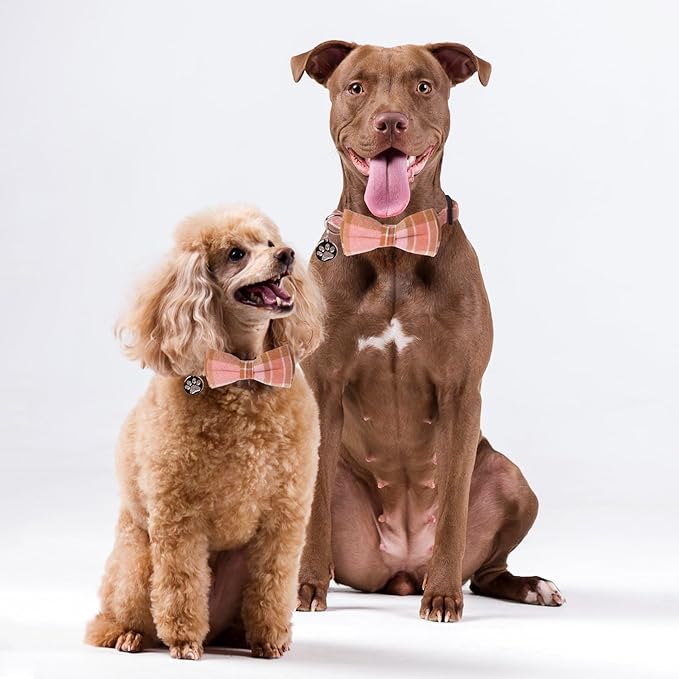 - Pink Plaid Dog Collar with Bowtie: Designed with cute pink plaid patterns, specially designed for girl dogs, let your dog be fashion and attractive everyday. The plaid dog bow is attached to collar using an elastic strap, the bowtie is detachable. The cute charm is made of stainless steel, you can carve your dog's infor on the back of the charm by yourself.