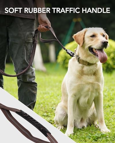 Joytale Tactical Dog Leash Heavy Duty, 4-6FT Shock Absorbing Bungee Lead with 2 Padded Handle, Metal Carabiner Clip, Car Seatbelt, Strong No Pull Leash for Medium Large X-Large Dogs, Brown