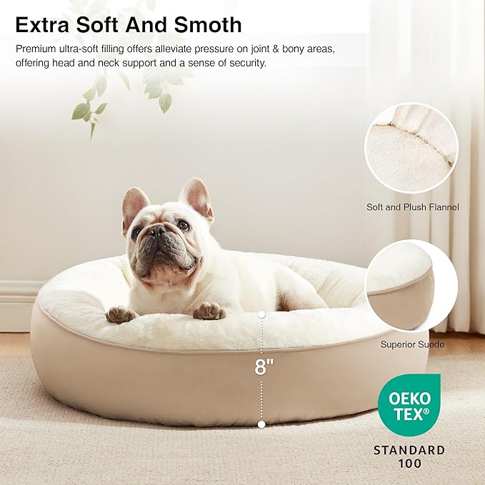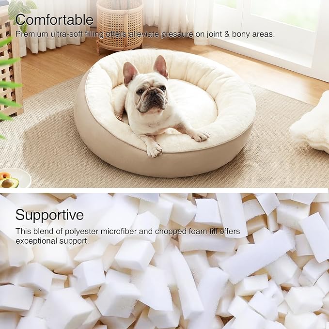- Donut Cuddler Shape: The round dog bed allows pets to curl up while the raised rim creates a sense of security and provides head and neck support. Premium ultra-soft filling offers joint and muscle pain relief, is a great choice for elderly or sick dog pets. The 25 inch round pet bed is perfect for cat or puppy and other pets up to 30 lbs.