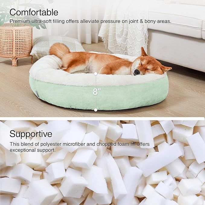 - Donut Cuddler Shape: The round dog bed allows pets to curl up while the raised rim creates a sense of security and provides head and neck support. Premium ultra-soft filling offers joint and muscle pain relief, is a great choice for elderly or sick dog pets. The 30 inch round pet bed is perfect for large dog and other pets up to 45 lbs.
