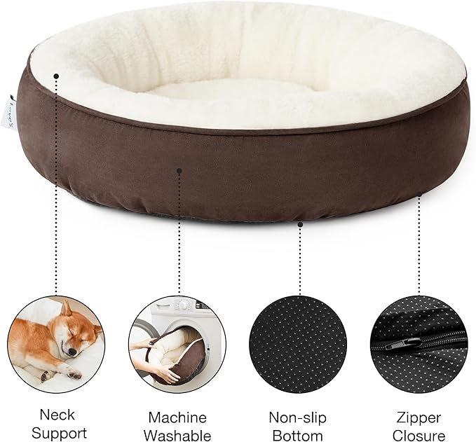- Donut Cuddler Shape: The round dog bed allows pets to curl up while the raised rim creates a sense of security and provides head and neck support. Premium ultra-soft filling offers joint and muscle pain relief, is a great choice for elderly or sick dog pets. The 30 inch round pet bed is perfect for large dog and other pets up to 45 lbs.