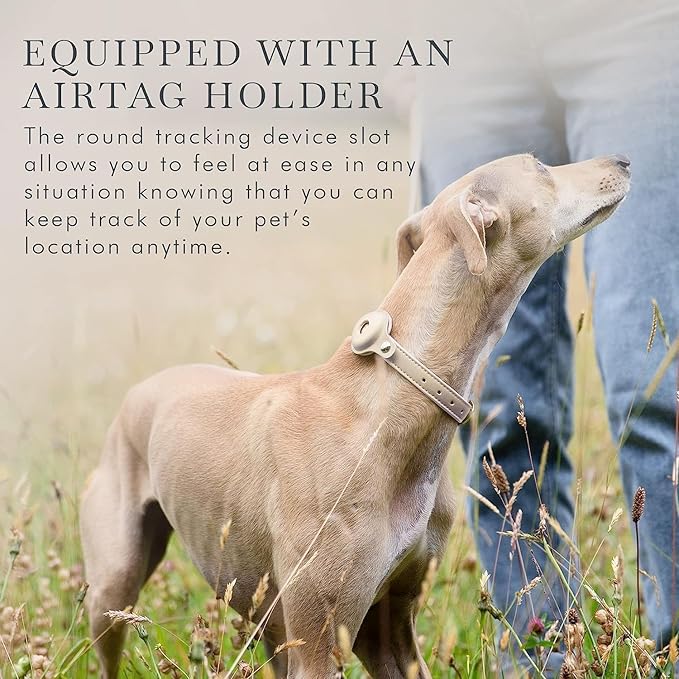 - WITH A DOG TRACKING DEVICE HOLDER: Nina Woof Cupertino Dog Collar is a good choice for pet owners who like using pet tracking devices. This vegan leather dog collar is Apple AirTag 2021-compatible. Equipping your pet with a tracking device can make you feel at ease by letting you know where your beloved animal is