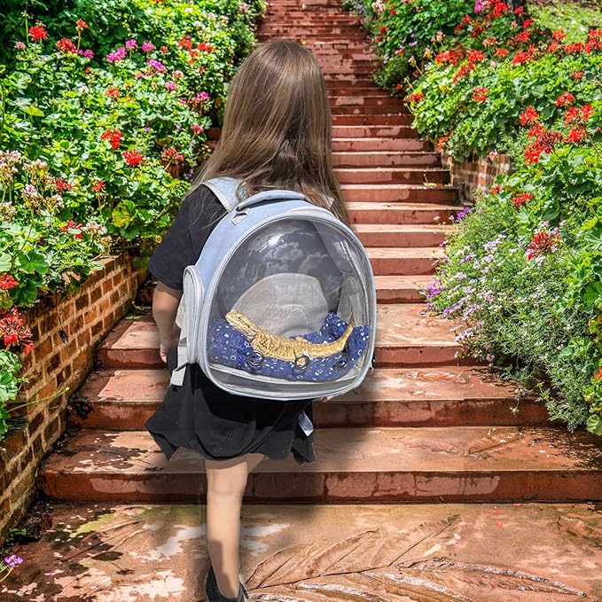 - Bearded dragon backpack carrier with leash and harness set has a big bubble Window. The front hard clear bubble window is better to protect reptile from crushing and attacking if accidents, it also provides a nice front view so they could check surroundings without anxiety.