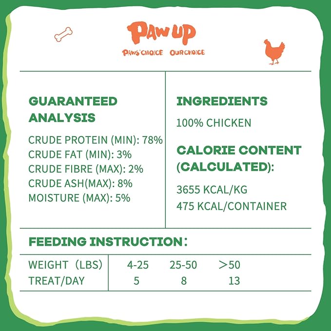 - Pure and Free of Additictives: PAWUP's freeze-dried chicken treats are RAWHIDE-FREE and GLUTEN-FREE, making them a safe and healthy choice for your beloved pets. Treat pets to a snack that is free from artificial additives, allowing cats, dogs to indulge in pure, natural delicious