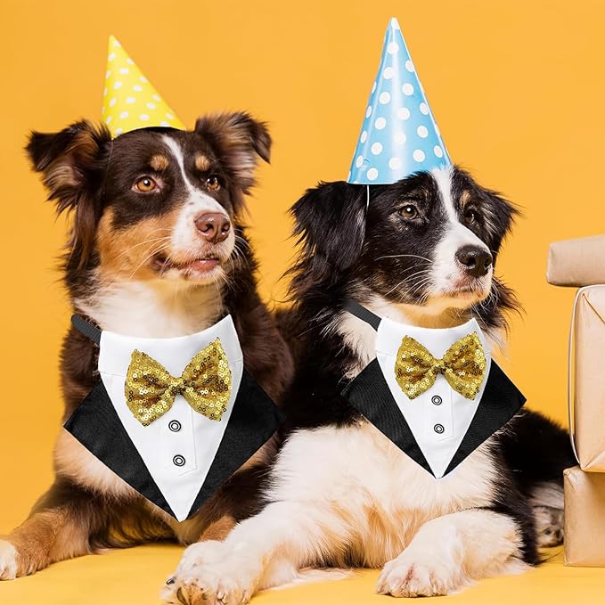 - Wedding Tuxedo Bandana: Formal dog tuxedo bandana dog collar costumes with a shiny gold bow tie is absolutely adorable and shining. Dog tux bandana is designed for wedding, engagement, Valentine's Day, Christmas, New Year's, photo shooting, Halloween, birthday party grand holidays or just daily use. It makes your lovely dog elegant and extra handsome, like a gentleman.