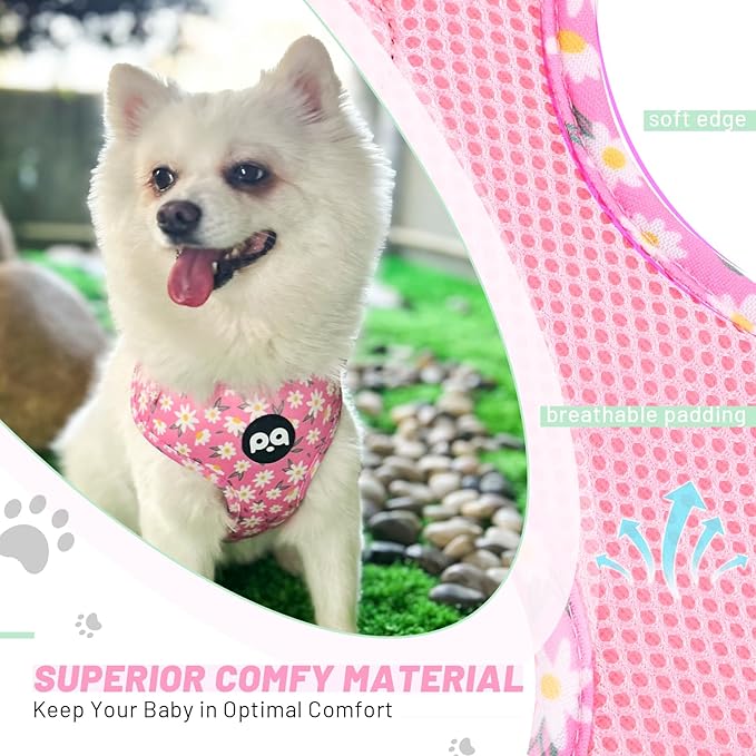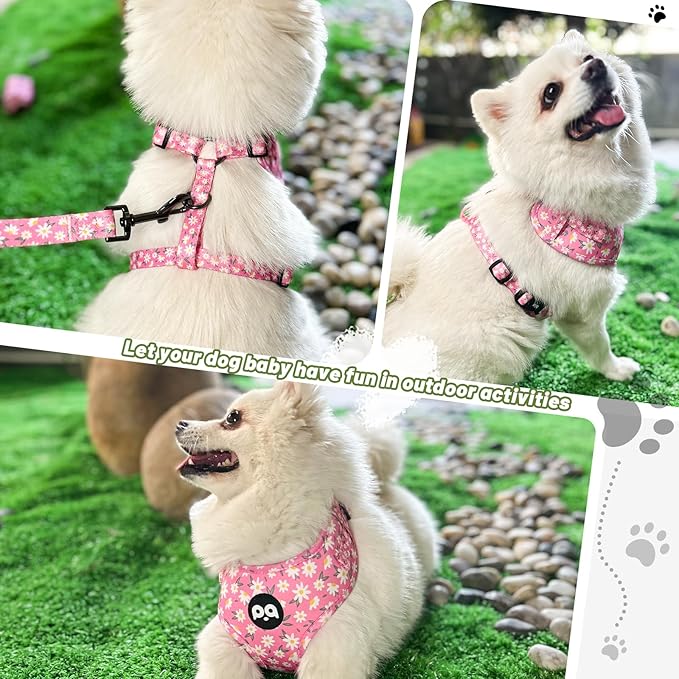 QQPETS Dog Harness Collar Leash with Poop Bag Holder 4 PCS Set, Adjustable No Pull Soft Mesh Padded Vest for Small Medium Large Pet Puppy Outdoor Walking (Daisy Pink, S (Chest 16.1”-22”))