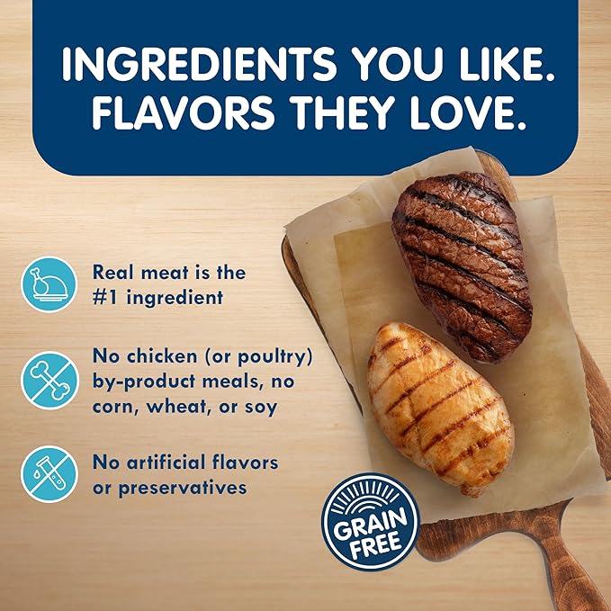 - GRAIN-FREE RECIPES: BLUE Delights Chicken, Prime Rib, and New York Strip recipes are grain-free and contain complex carbohydrates like potatoes, carrots, and peas