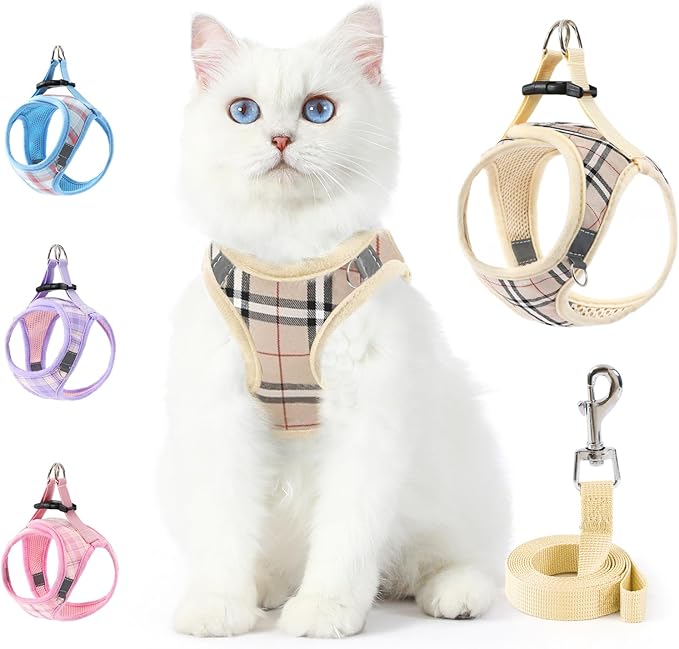 voopet Extra Small Dog Harness and Leash Lightweight Cat Comfort Padded Soft Mesh Vest Step in Dog Harness No Pull No Choke Reflective Small Plaid Girl & Boy Puppy Kitty Walking Harness, Beige XXS