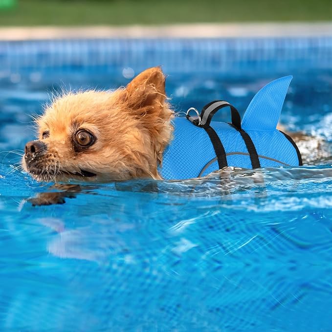 - Cute Shark Dog Life Jackets : Dog float jacket with standing shark fin catches people's eyes whenever your small breed dog is swimming in water or walking by the water side.