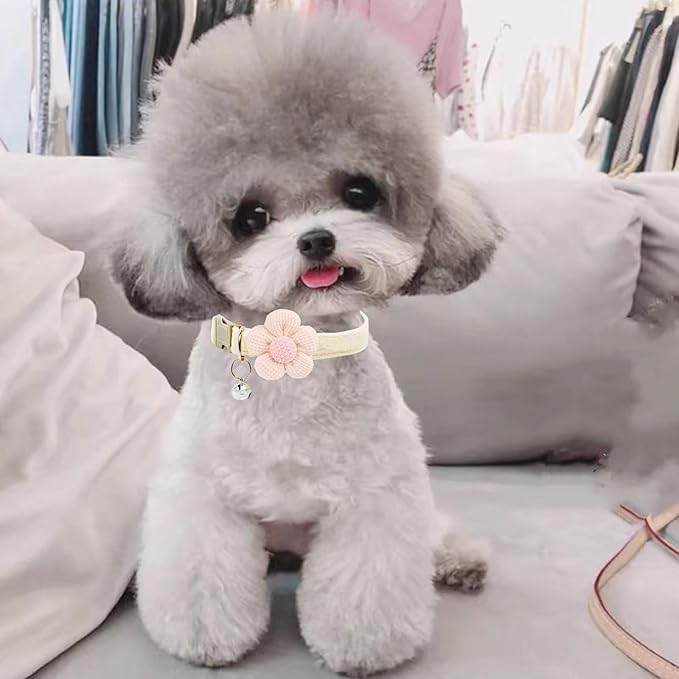 Puppy Collars for Litter, Small Dog Collar with Flower, XS Dog Collars for Small Dogs with Bell for Girl Boy Little Dog (Pink + White)