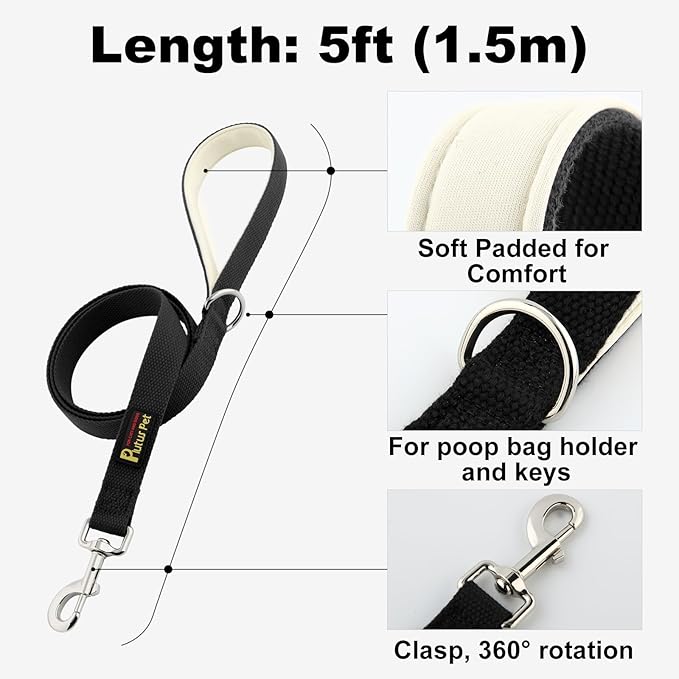 - The leash is 5ft or 150cm long, a perfect length to walk your dog. The XXS and XS sizes are 3/4’ or 2.0cm wide, and the S, M, and L sizes are 1’ or 2.5cm wide. The soft-padded handle ensures your grip remains comfortable, even during those energetic walks. Additionally, the D-ring on the handle provides a handy spot for hanging keys or accessories, adding convenience to your walks.