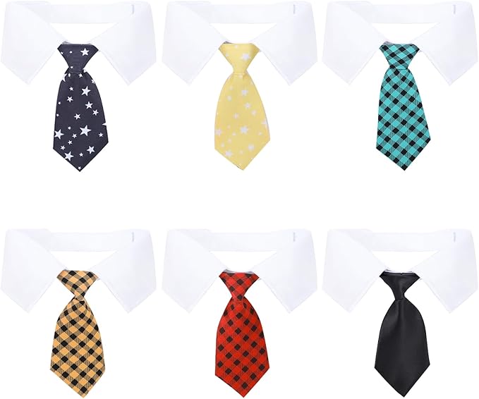 - Nice Variety: Enhance your pet's wardrobe with our set of six charming neckties. Choose from a variety of colors, including solid black, as well as stylish patterns like yellow and black pattern, blue and black pattern, red and black pattern, yellow with white stars and black with white stars.
