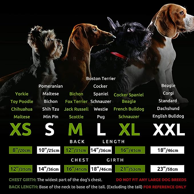 - FOR SMALL DOGS OR CATS. Please priority follows the chest size. Size XXL, fits 18" back, 23" chest. Recommended for: Beagle, Corgi, English Bulldog, Boxer, Chow Chow, and Standard Dachshund.