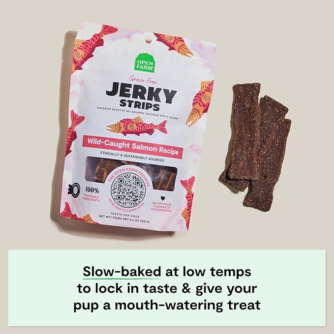 Open Farm, Dog Jerky Treats, Soft & Chewy Oven-Baked Jerky Strips Made with Ethically & Sustainably Sourced Ingredients, Protein Packed Dog Treats, Grain-Free Wild-Caugh Salmon Recipe, 5.6oz Pouch