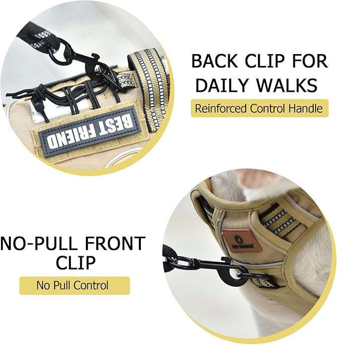 - MOLLE System: Featuring multiple Hook & Loop panels and additional MOLLE straps, our tactical harness can carry a variety of equipment, including pouches, water bottles, and tactical dog gear. It's versatile for personal service, law enforcement, hunting, or outdoor adventures. This system also shows your dog's personality; the package includes an extra "BEST FRIEND" label for customization.