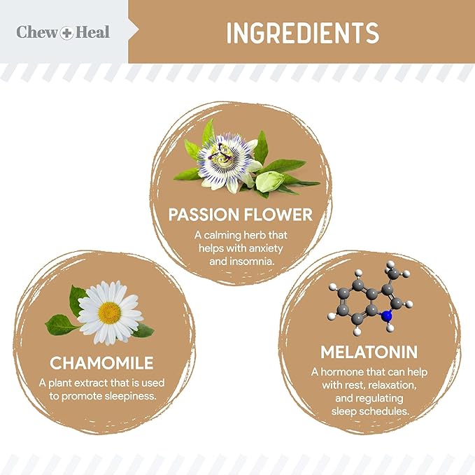 - Natural Sleep Aid: Melatonin for dogs helps regulate sleep and wake cycles, promoting rest and relaxation. Chamomile aids sleepiness, while passion flower offers relaxation and stress relief, making it a perfect sleep aid for dogs