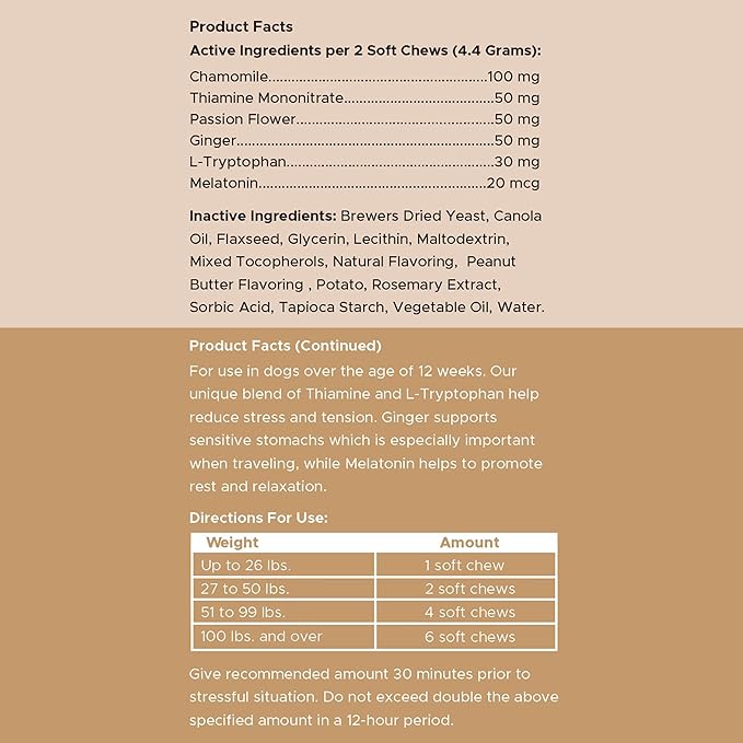- Calming Ingredients: Our calming treats for dogs include thiamine and L-tryptophan to help reduce stress and tension. Thiamine (B1) is water soluble with calming properties, while L-tryptophan boosts serotonin, a calming neurotransmitter