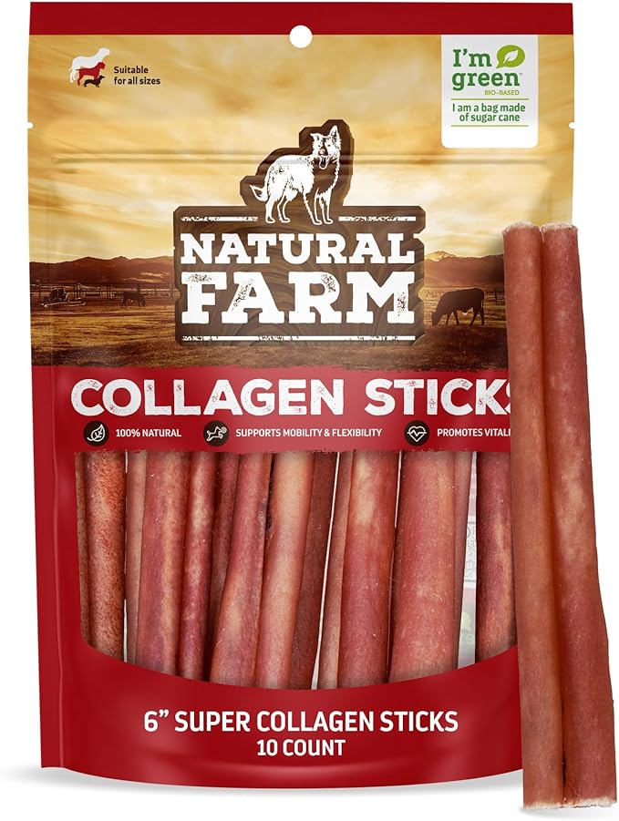 Natural Farm Odor-Free Super Collagen Dog Chews (6-Inch, 10-Pack) The First Ever Real Bull Sticks Alternative: 100% Natural Angus Hide Collagen Treats - More Protein, More Chew Time for All Dogs
