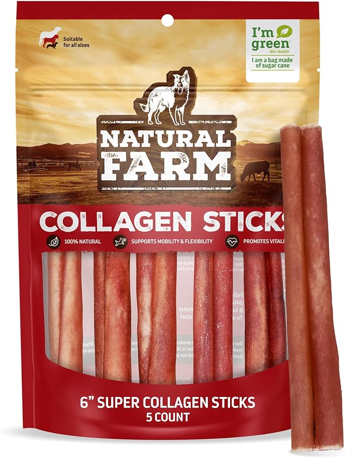 Natural Farm Odor-Free Super Collagen Dog Chews (6-Inch, 5-Pack) The First Ever Real Bull Sticks Alternative: 100% Natural Angus Hide Collagen Treats - More Protein, More Chew Time for All Dogs
