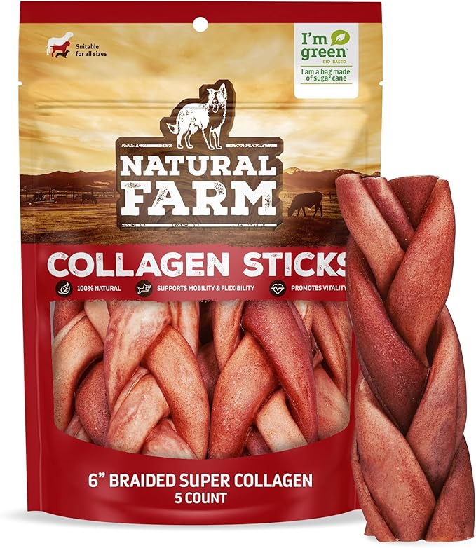 Natural Farm Odor-Free Super Braided Collagen Dog Chews (6-Inch, 5-Pack) First Ever Real Bull Sticks Alternative, 100% Natural Angus Hide Collagen Treats- More Protein More Chew Time for All Dogs