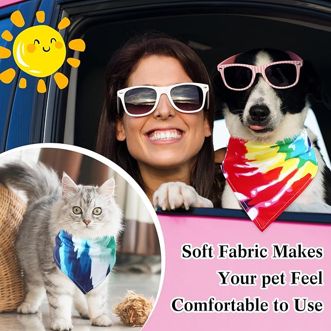 - Eye Catching Tie Dye Design: these dog bandanas are styled with bright, tie dye colors, adding vibrancy and fun to your pet's look; Wearing our triangle dog bibs at various events will turn heads and make your beloved pet the center of people's attention