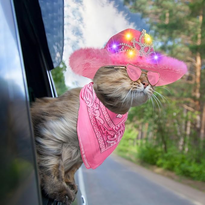 Aliceset 3 Pcs Pet Cowboy Costume Cat Cowboy Accessories Set Neon Sparkly Dog Cowboy Hat Paisley Bandanna Collar and Sunglasses LED Light up Western Small Cat Dog Cowgirl Costume(Pink, Crown)
