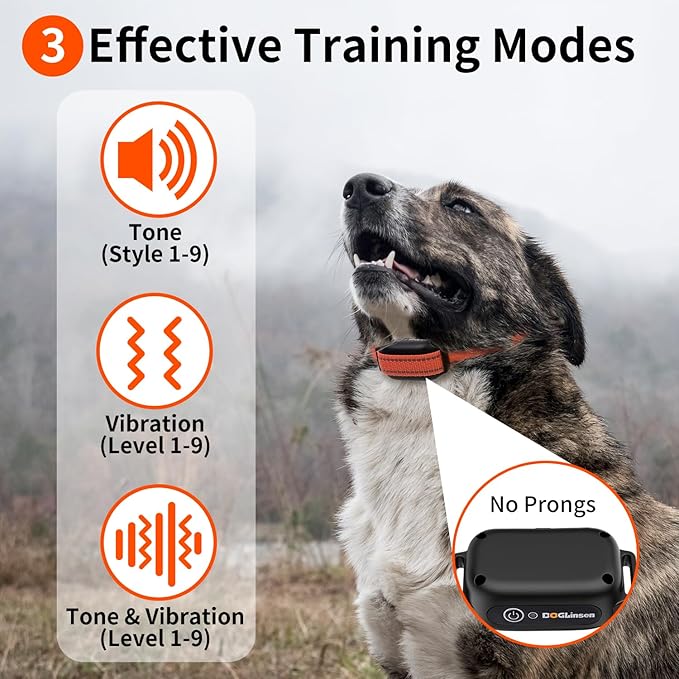 - 【 No Shock, No Prongs 】 With 9 different tone and vibration modes, as well as a synchronized tone and vibration training mode, this vibrating dog collar ensures the safety and comfort of your dog without prongs on the receiver digging into the dog's neck