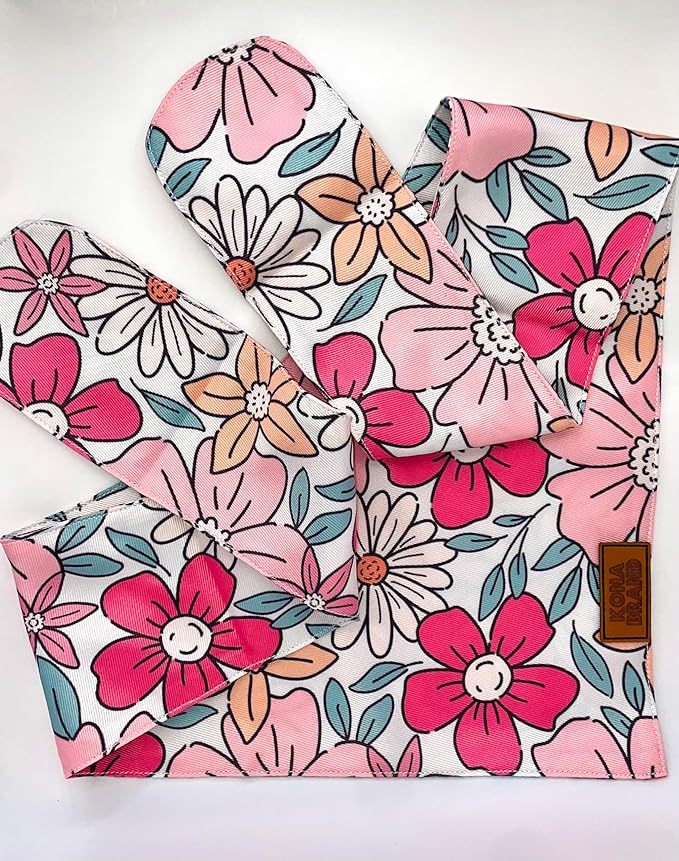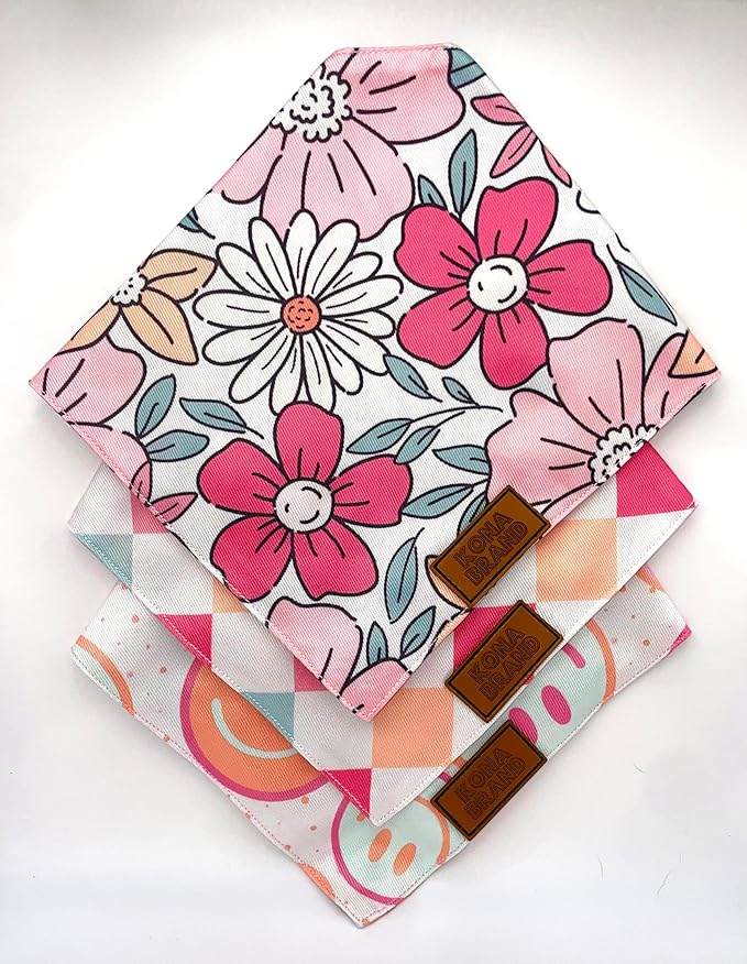 - Kona Brand Co. Luxury cat and dog bandanas. Handmade with premium silky but durable polyester fabric. Resistant to dirt and easy to wash! Custom cut/ design so they won’t roll down like other bandanas! Lightweight and breathable. Fun designs! Small 14” – fits necks up to 13” Medium 18” – fits necks up to 18” Large 22” – fits necks up to 24”