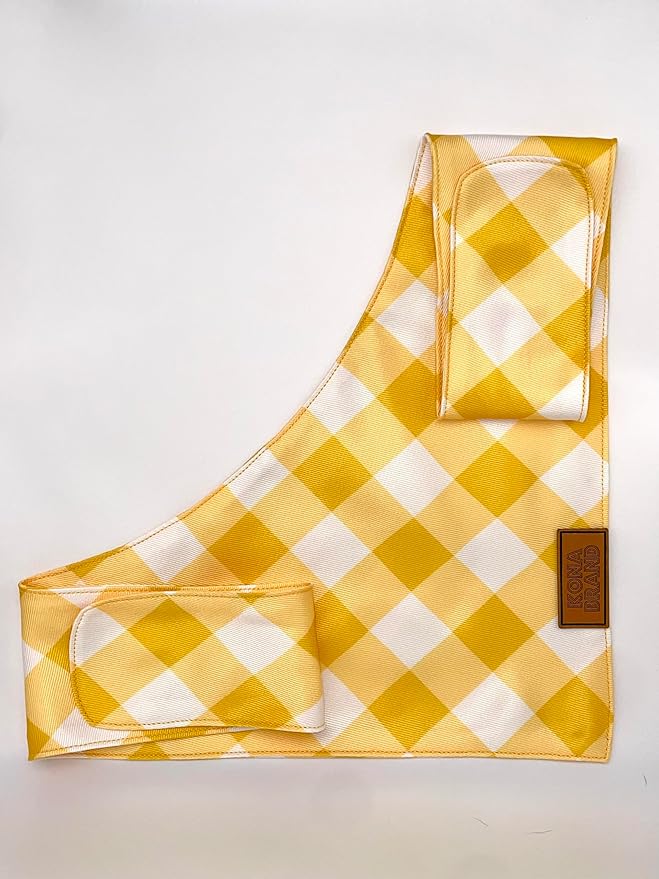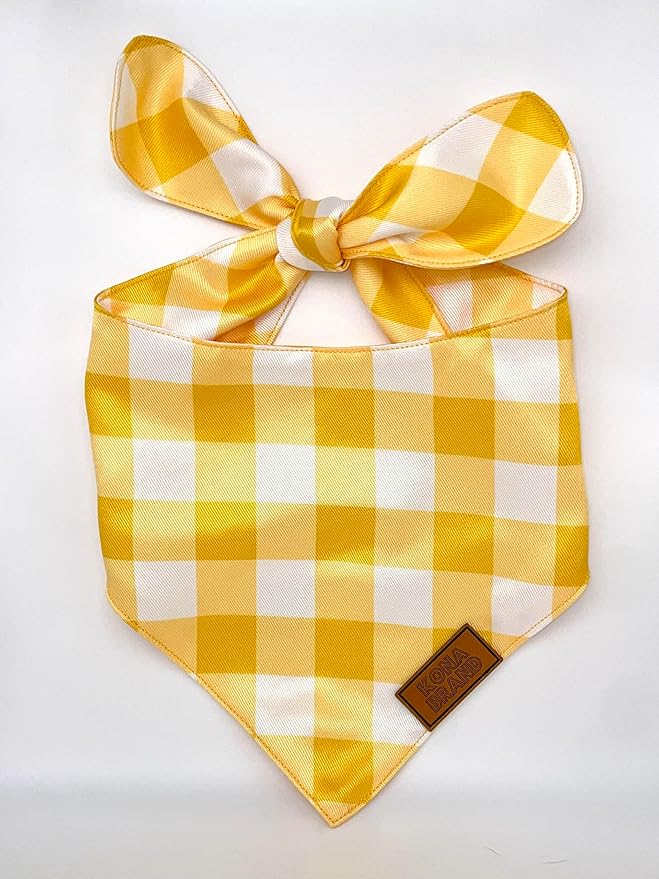 - Kona Brand Co. Luxury cat and dog bandanas. Handmade with premium silky but durable polyester fabric. Resistant to dirt and easy to wash! Custom cut/ design so they won’t roll down like other bandanas! Lightweight and breathable. Fun designs! Small 14” – fits necks up to 13” Medium 18” – fits necks up to 18” Large 22” – fits necks up to 24”