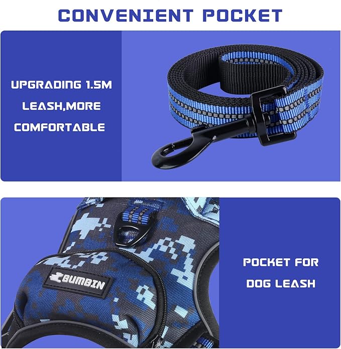 BUMBIN Dog Harness for Large Dogs, No Pull Adjustable No Choke Pet Vest with Dog Leash Fit Smart Reflective Pet Walking Harness for Training Easy Control Soft Handle Blue Camo L