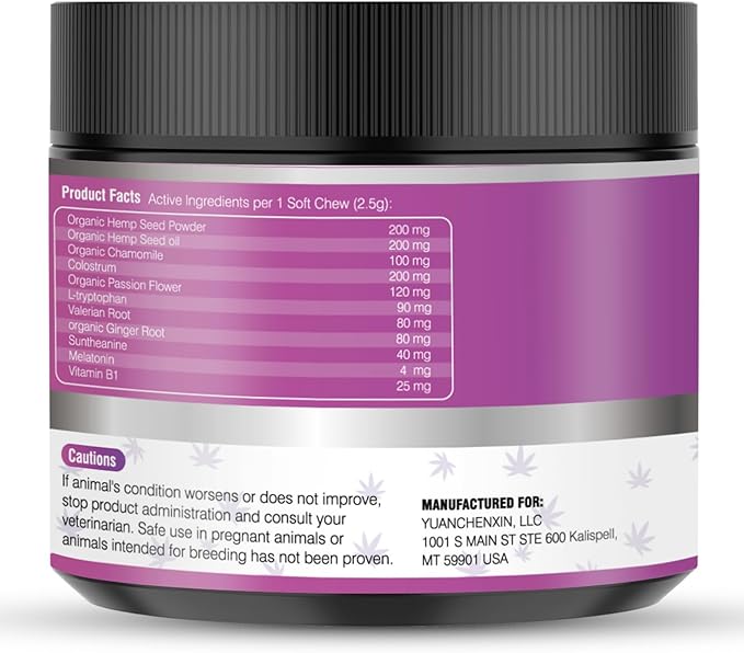 - [Safe and Harmless Calming Treats] Hemp dog treats for calming contain safe, natural ingredients that wonβt cause discomfort to your dog. Calming chews for puppies contain organic chamomile, L-tryptophan, valerian root, organic ginger root, vitamin B1, and more to help reduce anxiety, fear, or excessive excitement in dogs. Contain no grains, corn or soy derivatives, calming dog treats provide natural calming. Hemp calming chews for dogs are trusted by veterinarians to help dog anxiety relief