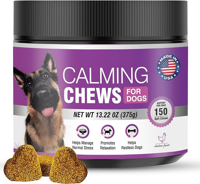 - [Promotes Calm and Anxiety Relief for Dogs] Calming chews for dogs effectly soothe and reduce dog anxiety. Calming care for dogs can help dog calm down when he or she is anxious and agitated, and dog calming chews also help to aid dog sleep. Calming dog treats are suitable for use in a variety of situations such as dog anxiety caused by thunderstorms, separations, car rides, veterinary visits and other stressful situations. Dog calming treats provide hours of calm relaxation and peace of mind