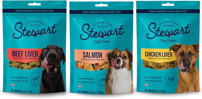 Stewart Freeze Dried Dog Treat Variety, Beef Liver, Salmon, & Chicken Liver, Resealable Pouch, Grain Free & Gluten Free, Single Ingredient Treats; 4 oz Beef Liver, 2.75 oz Salmon, & 3 oz Chicken Liver
