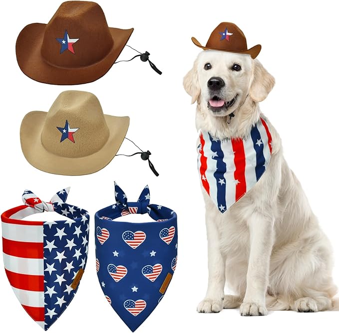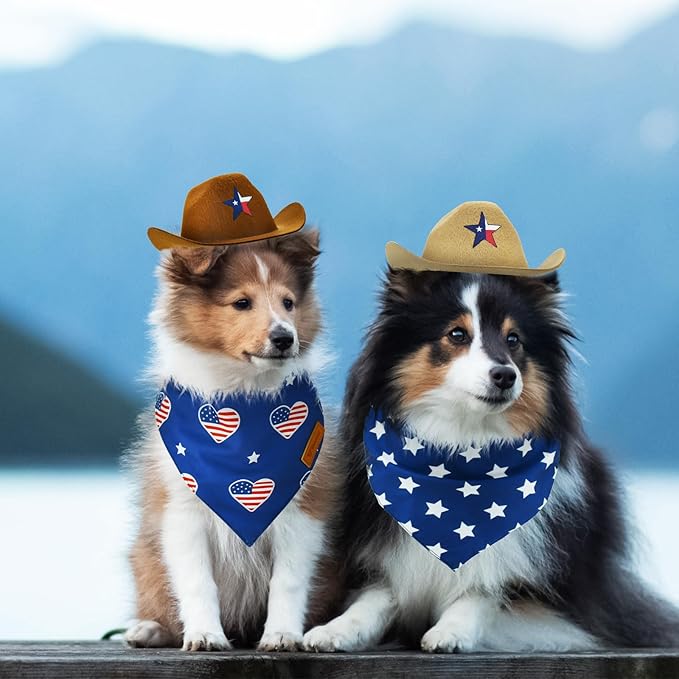 - 【4Pcs in a Package】The Independence Day dog accessories package includes 2x dog cowboy hats with pentacle pattern in the front, 2x 4th of July dog bandanas with American flag, stars and stripes pattern. These 2 sets of dog independence day costumes, enough quantity of accessories to mix match to dress up your dogs or cats.
