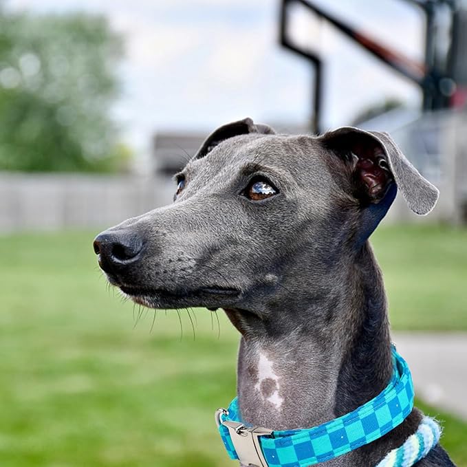 Maca Bates Checkered Mint Blue Dog Grid Collar for Small Dogs Adjustable Plaid Collars Accessories Gift for Small Medium Large XL Puppy with Golden Metal Buckle